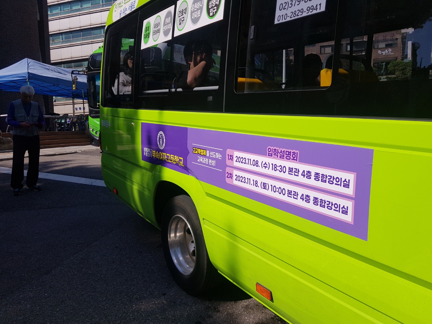 11월 18일(수요일) 저녁 6시 30분에 있으니까 직장과 학교를 마치고 이 버스를 타면 여기 상명대 부속여고에 당도할 수 있을 겁니다. 아이의 미래를 책임지게 될 고등학교 선택에 신중을 기해 보세요~