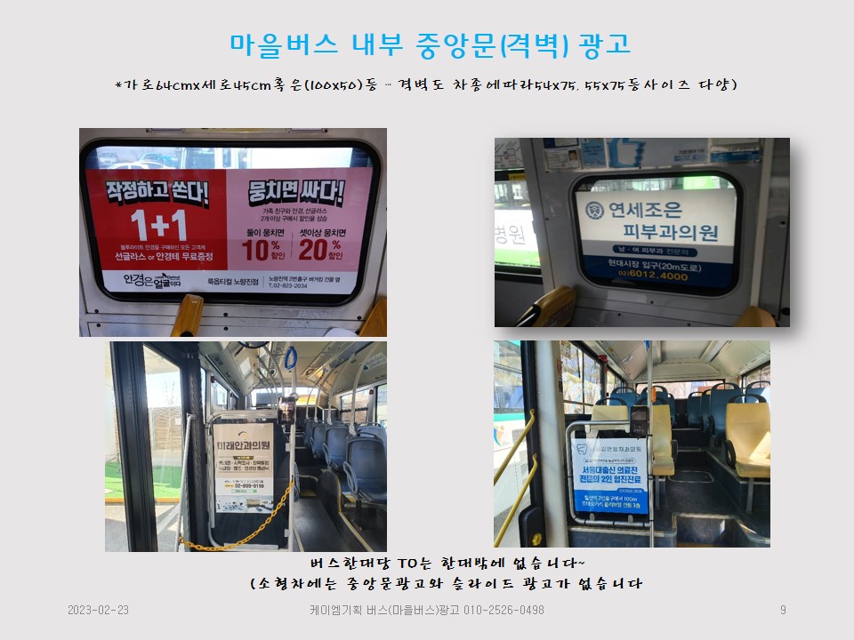 마을버스내부부착광고는 중앙문 광고와 하차문광고 시트커버광고처럼 버스 한 대에 한 가지 광고만 하면 끝인 광고가 있으나 서대문 08번이나 종로 13번 마을버스처럼 소형버스에는 중앙문 광고나 하차문 광고는 없습니다~