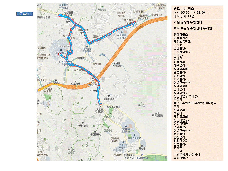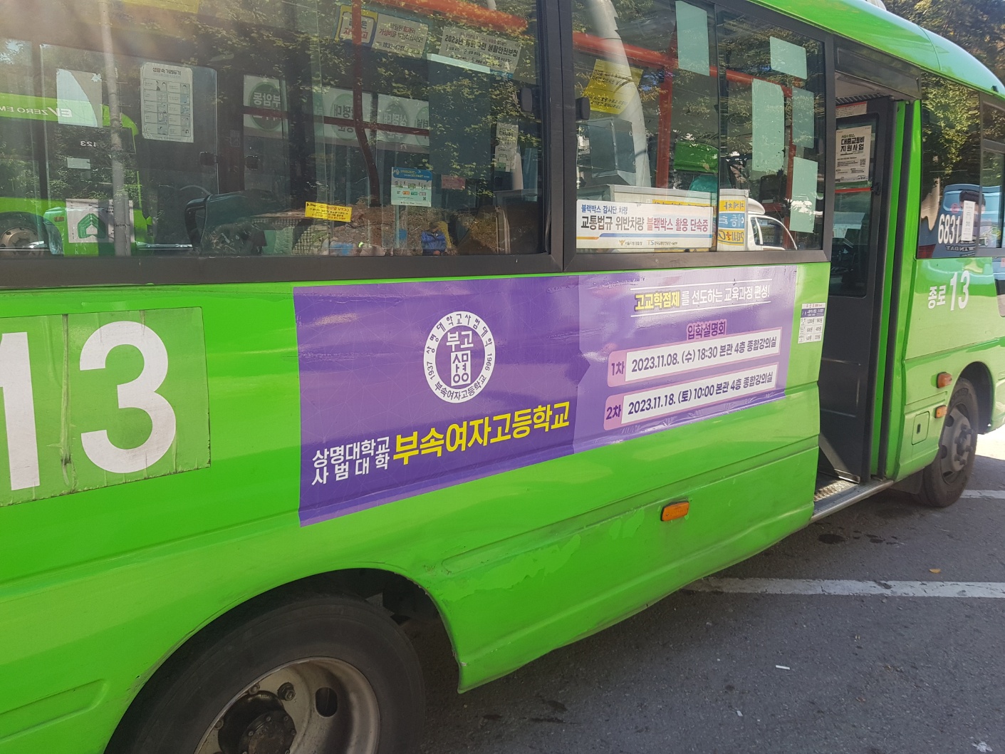 종로 13번 마을버스는 부암동 방면에서 등교하기가 편한 마을 노선이고, 근처 고등학교 진학 예정 학생들에게 홍보하고자 여기에 광고를 부착하였습니다.